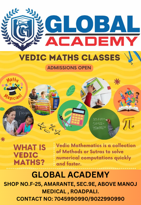 GLOBAL ACADEMY ADMISSION OPEN FOR VEDIC MATHS CLASSES Benefits of Vedic Maths: Simplifies Complex Calculations Improves Speed and Accuracy Enhances Cognitive Skills Boosts Confidence and Interest in Maths Applicable in Daily Life Helps in Competitive Exams HURRY UP CONTACT NO: 7045990990/9022990990