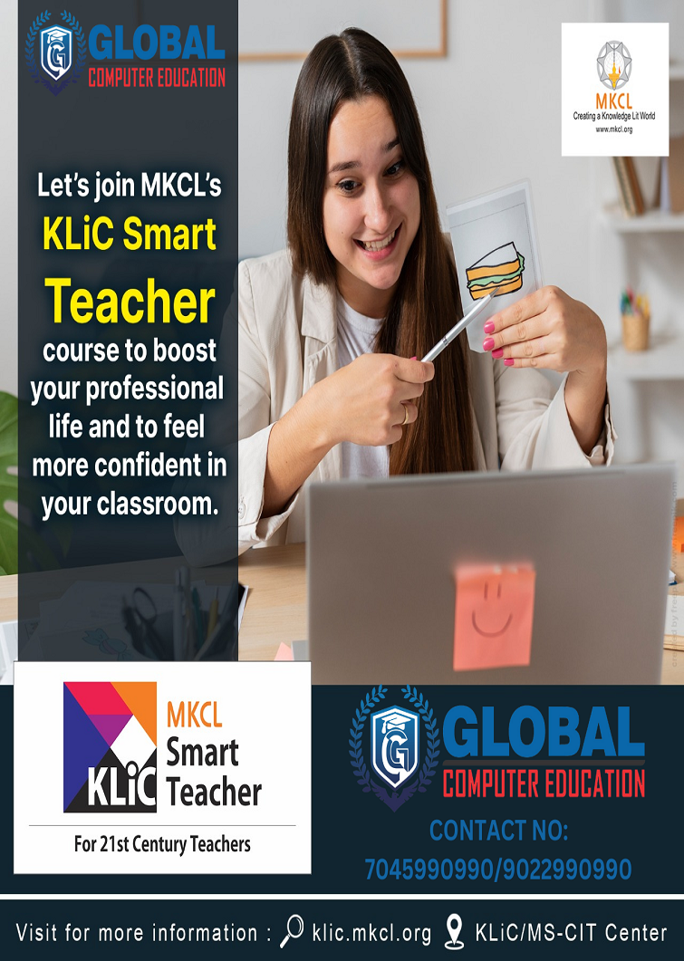 GLOBAL COMPUTER EDUCATION ADMISSION OPEN FOR KLIC SMART TEACHER COURSE Course Features: Language: English, Marathi Duration: 60 hours (1 month) Learning Mode: Center, At Home on Laptop/ Desktop Jurisdiction: Nationwide Certificate of Completion Eligibility Teachers who wish to use Smart ways of Teaching. Learner should preferably a std. 10th Pass student (Not Compulsory) It is desirable that Learner should have done MS-CIT Course (Not Compulsory) CONTACT NO: 7045990990/9022990990