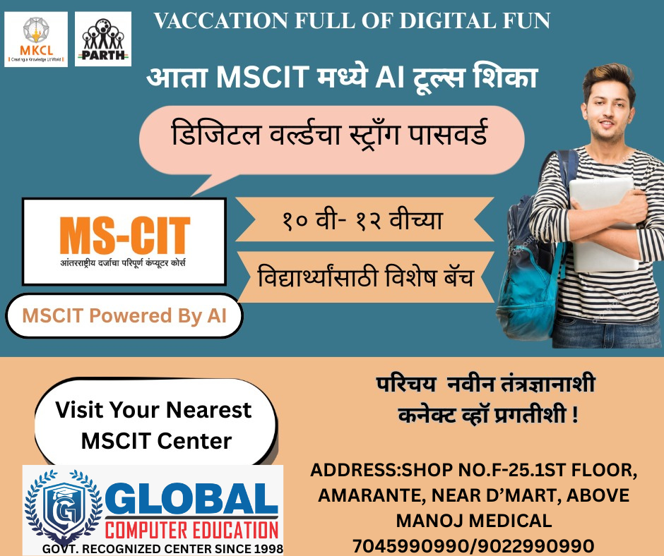 GLOBAL COMPUTER EDUCATION GOVT. AUTHORIZED CENTER SINCE 1998 ADMISSION OPEN FOR MS-CIT COURSE Learn 200+ Digital Skills With 100 AITools in MS-CIT Basic Computer and Smartphone Skills Smart Typing Skills Digital Skills for Daily Life Office Productivity Skills Digital India Skills Career & Job Readiness Skills New Age Study Skills Prompt Engineering Skills Social Media Skills Cyber Security Skills Google Tools Skills Netiquettes, Ergonomics, Go-Green Skills AI 100 TOOLS SKILL CONTACT NO:7045990990/9022990990