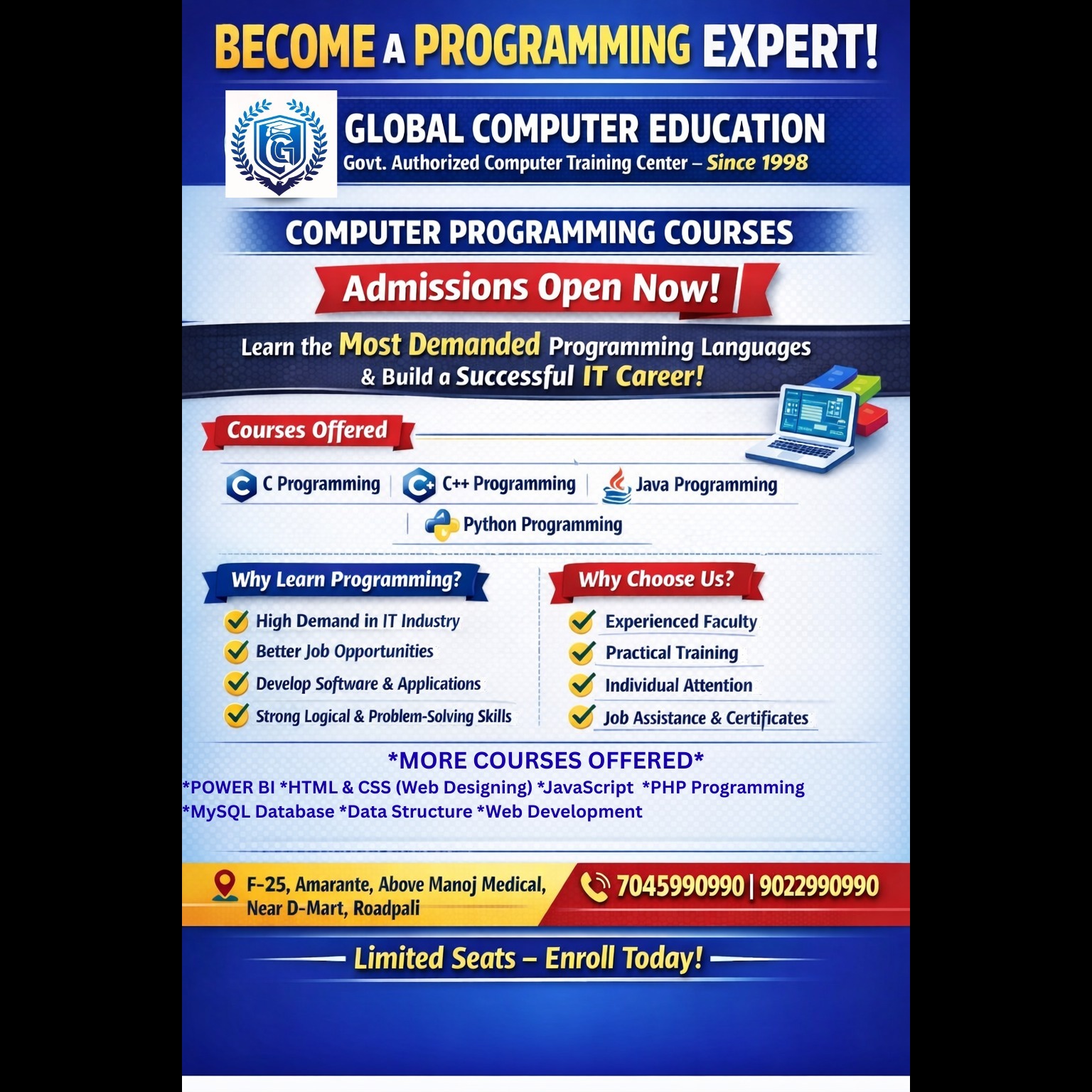 *GLOBAL COMPUTER EDUCATION* Govt. Authorized Computer Training Center – Since 1998 💻 COMPUTER PROGRAMMING COURSES 🚀 Admissions Open Now! Learn the Most Demanded Programming Languages and build a successful IT Career. 📚 Courses Available ✔ C Programming ✔ C++ Programming ✔ Java Programming ✔ Python Programming 🎯 Why Learn Programming? ✔ High demand in IT industry ✔ Better job opportunities ✔ Develop software & applications ✔ Strong logical and problem-solving skills ⭐ Why Choose Global Computer Education? ✔ Experienced & Professional Faculty ✔ Practical Based Training ✔ Individual Student Attention ✔ Job & Career Guidance ✔ Certificate CourseS 📍 Address F-25, Amarante, Above Manoj Medical, Near D-Mart, Roadpali 📞 Contact: 7045990990 / 9022990990 🔔 Limited Seats – Enroll Today!