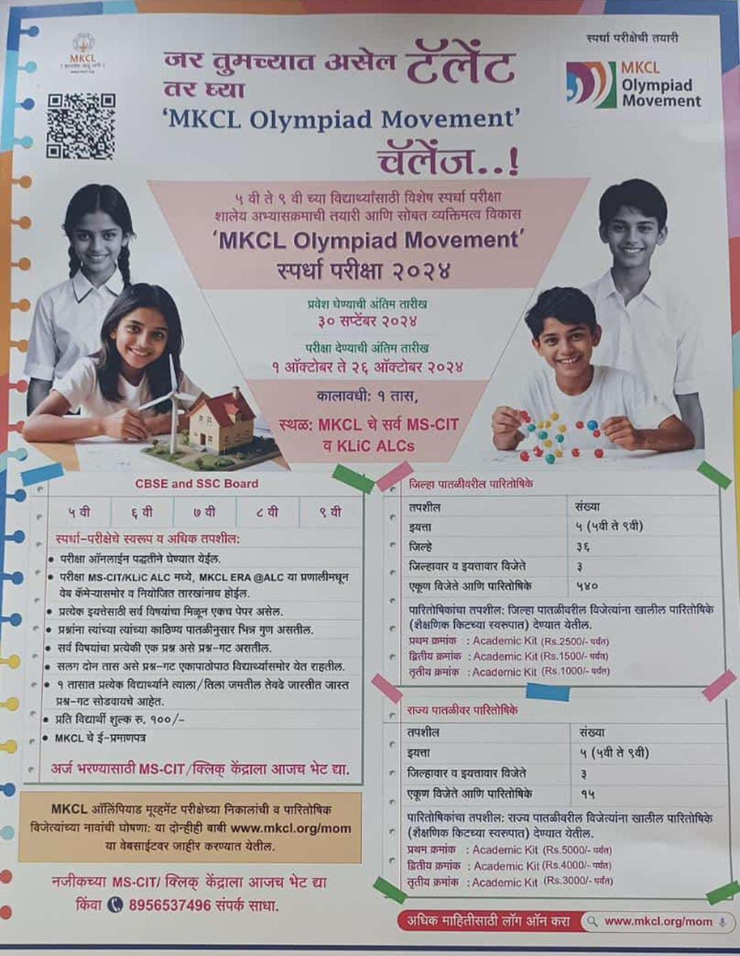 GLOBAL COMPUTER EDUCATION MAHARASHTRA OLYMPIAD MOVEMENT (MOM) EXAM 2024 Maharashtra Olympiad Movement (MOM) is accomplished through Authorized Learning Centers (ALCs) of MKCL, since 2007. The MOM program has been designed to help students prepare for International and National exams like Olympiads, Homi Bhabha, NTSE, MTSE, etc. Sub Junior & Junior are the 2 different categories that come under the MOM. For the 1st category, students from standard 5, 6 and 7 are eligible while for the 2nd category, 8th, 9th and 10th students are eligible. The exam will be conducted in two stages. Students will qualify for stage 2, based on their performance in stage 1. The exam will consist of three sections i.e. Science, Mathematics and Mental Ability. More stress will be given on the subject Science. Number of questions asked for stage 1 will be 100 and that for stage 2 will be 50. Total marks for both the stages will be 100. Duration of examination will be 120 minutes for stage 1 and 100 minutes for stage 2 Fees Sub Junior category - Course fee - Rs. 100 for full academic year Question Bank - Rs. 150 Junior Category Course fee - Rs. 125 for full academic year Question Bank - Rs. 200 Center: GLOBAL COMPUTER EDUCATION CONTACT NO: 7045990990/9022990990