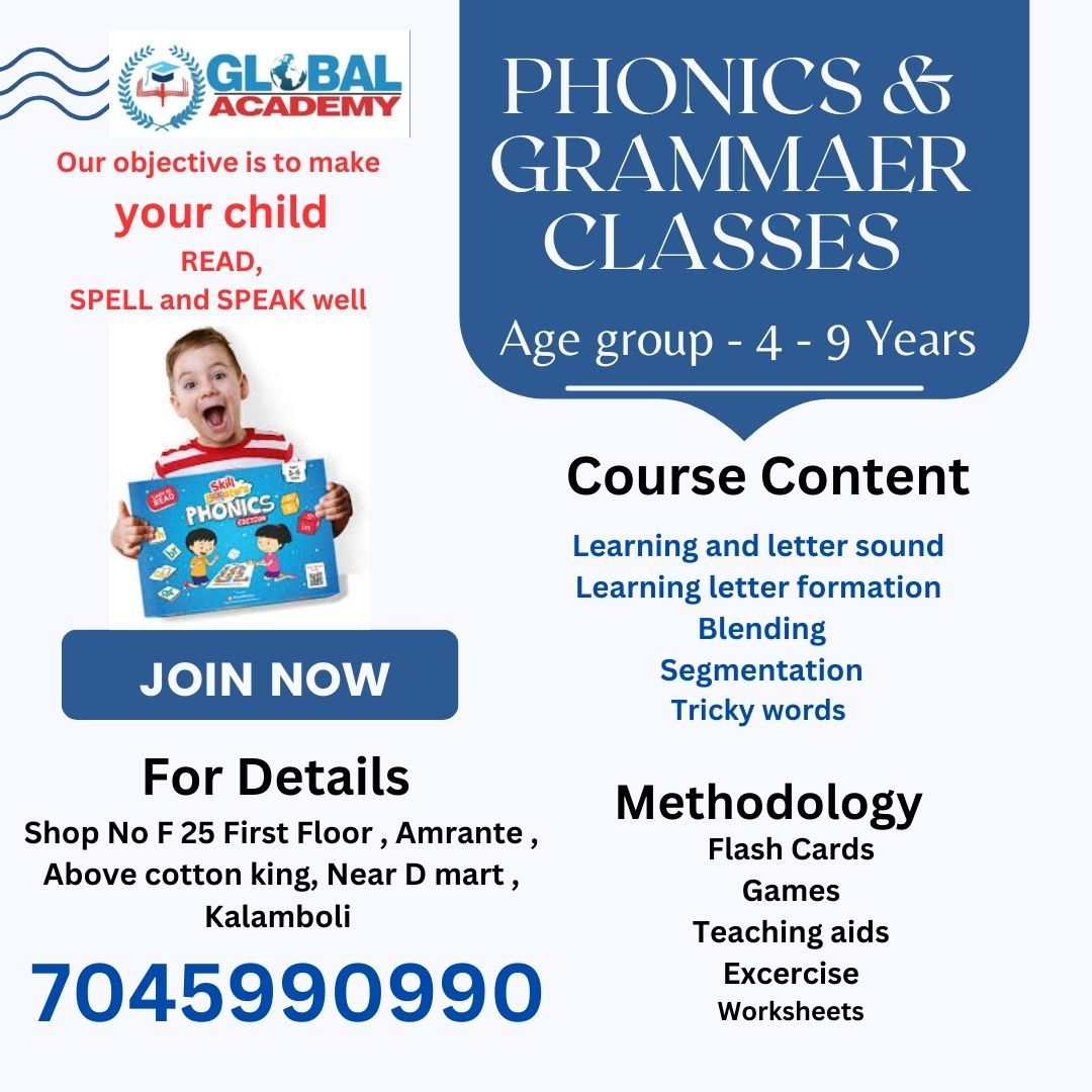 GLOBAL ENGLISH SPEAKING ADMISSION OPEN FOR PHONICS AND GRAMMER CLASSES Phonics is a way of teaching children how to read and write. It helps children hear, identify and use different sounds that distinguish one word from another in the English language. These 5 key principles of English grammar are: WORD ORDER. As an analytic language, English uses word order to determine the relationship between different words. ... PUNCTUATION. In written English, punctuation is used to signify pauses, intonation, and stress words. ... TENSE AND ASPECT. ... DETERMINERS. ... CONNECTORS. CONTACT NO:7045990990/9022990990