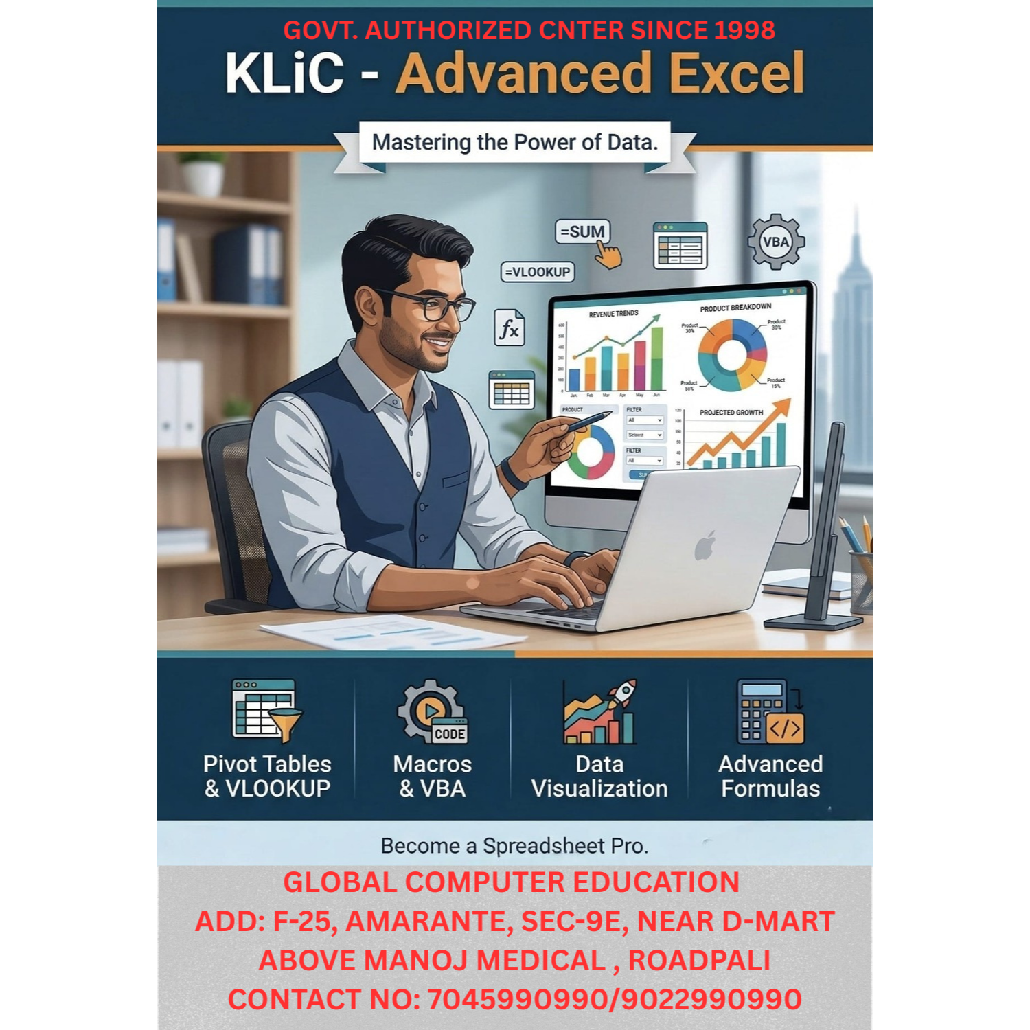 GOVT. AUTHORIZED CENTER SINCE 1998 Your Gateway to Advanced Excel Skills Why Choose Us? Trusted & Recognized: Govt. Authorized since 1998, ensuring quality and credibility. Comprehensive Courses: Master Pivot Tables, VLOOKUP, Macros, VBA, Data Visualization, and more. Career Boost: Enhance your employability and efficiency in data management. Experienced Instructors: Learn from industry experts with years of teaching excellence. Affordable & Accessible: Quality education at competitive rates. Importance of Excel Skills in Today’s World:In today's data-driven world, mastering Excel is crucial for professionals across all industries. It helps in making informed decisions, increasing productivity, and gaining a competitive edge. Join Us Today! GLOBAl COMPUTER EDUCATION Address: F-25, Amarante, Sec-9E, Near D-Mart, Above Manoj Medical, Roadpali Contact: 7045990990 / 9022990990 Invest in Your Future. Master Excel & Unlock Opportunities!